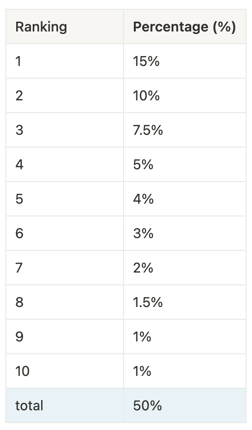 Top 10 Players on the leaderboard will share 50% of the prize pool, distributed according to their rankings.