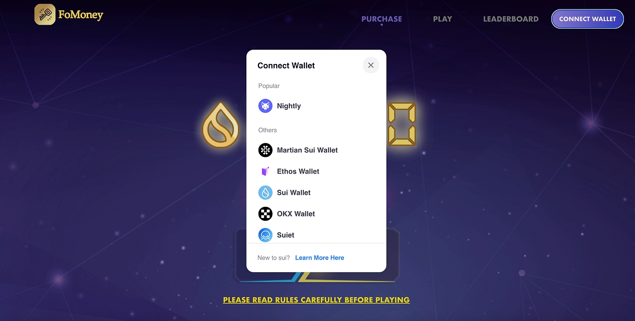 To play FoMoney, you can connect multiple SUI wallets to purchase KEYs and participate in the game.