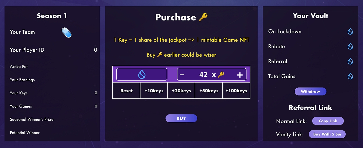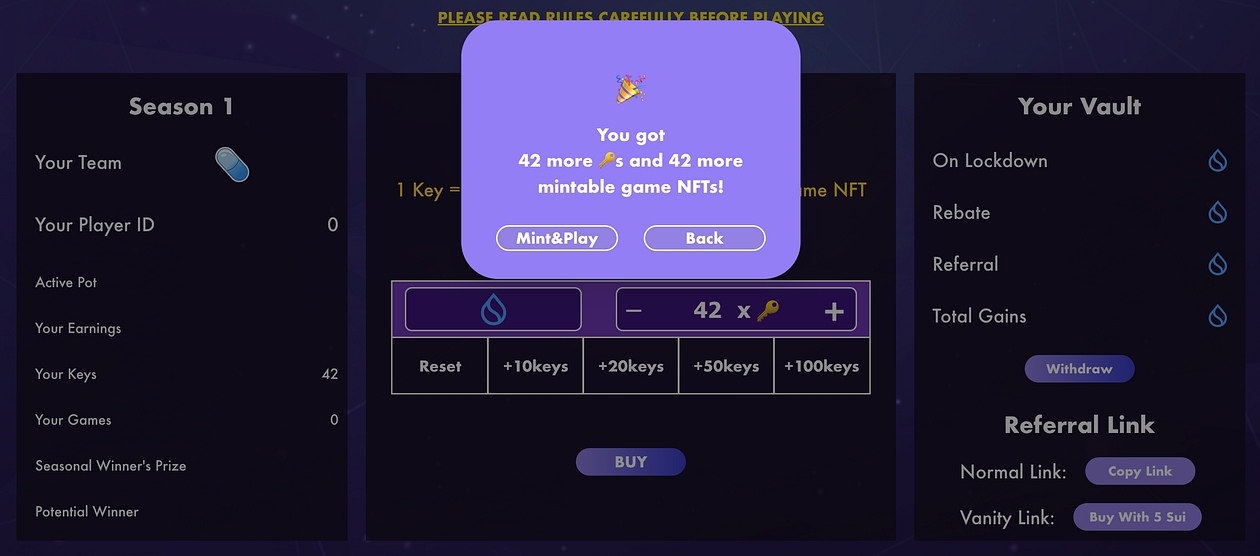 To start your FoMoney journey, acquire at least 1 KEY using SUI and mint a minimum of 1 Game NFT. The starting price of 1 KEY is around 0.15 SUI, and the price of KEYs would increase as the amount of SUIs in the prize pool increases. Make sure that you have enough test tokens for purchasing KEYS.