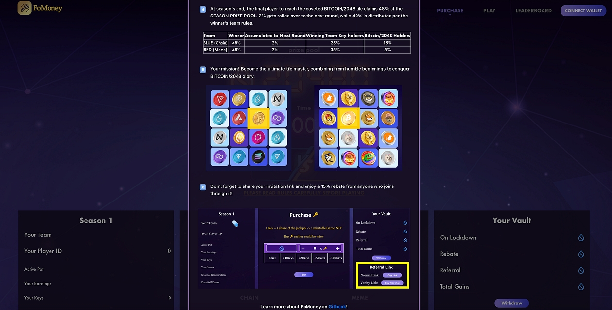 FoMoney follows the classic 2048 rules, with pictures replacing numbers on the tiles. Click “Mint New Game” to begin. The minted Game NFT will record your current game state.