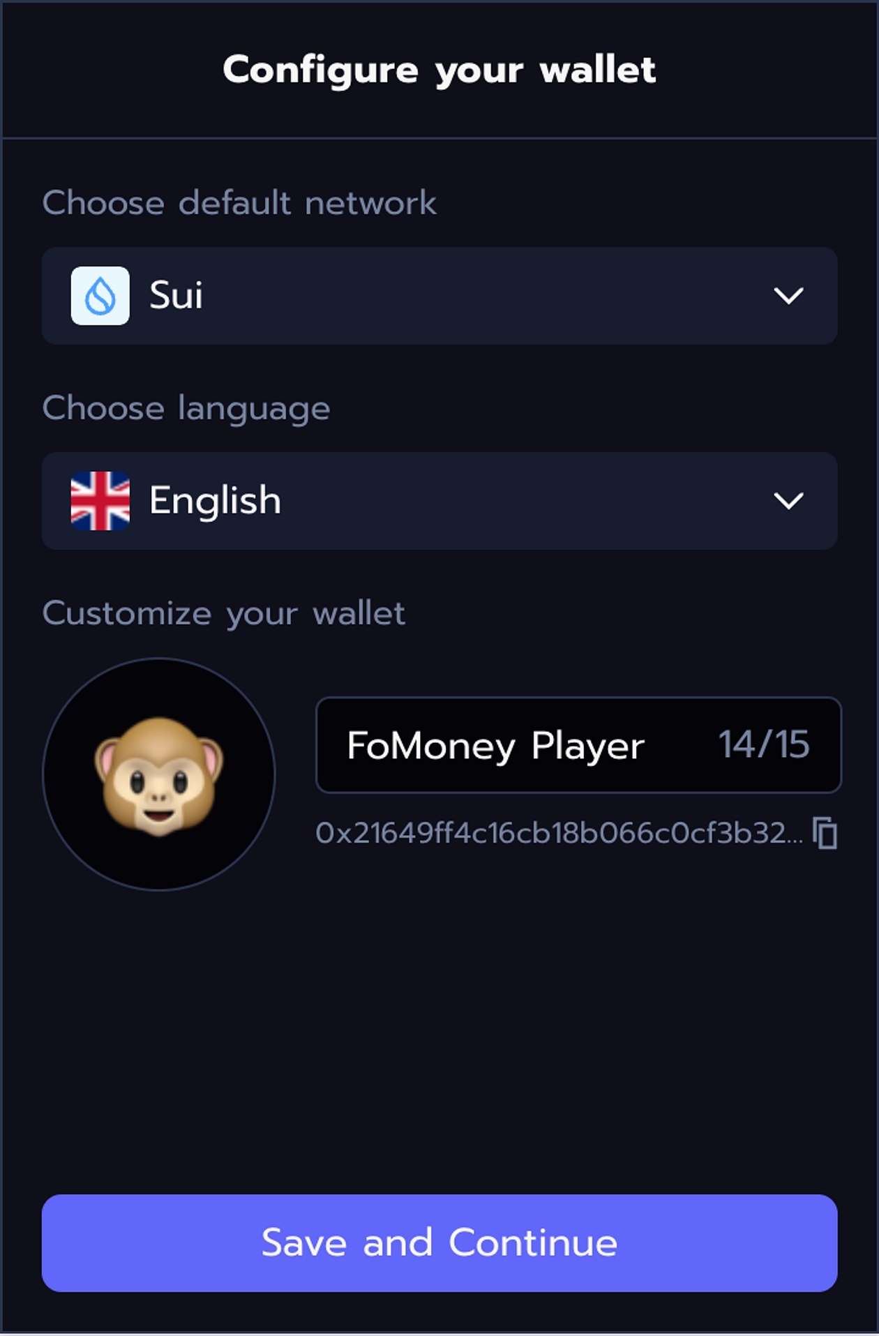 Choose SUI as the default network and select your preferred language. Remember to keep your private key and recovery phrase secure.