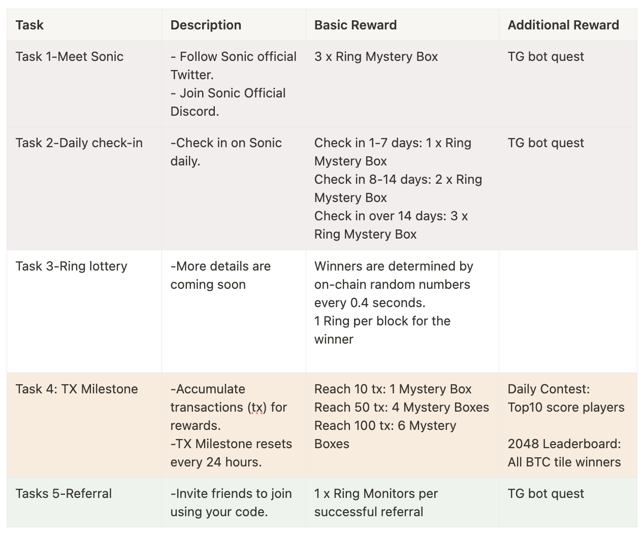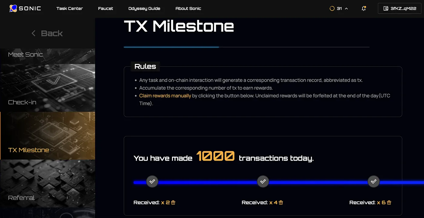 > You can earn basic rewards through Tx milestones, and an additional prize pool of 1 million+ Sonic Rings will be available once the leaderboard is ready.