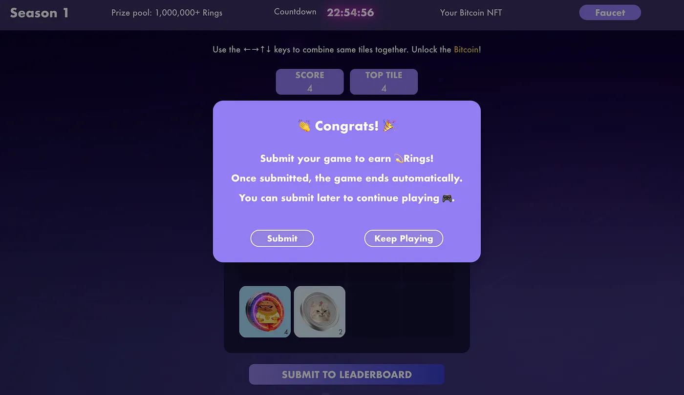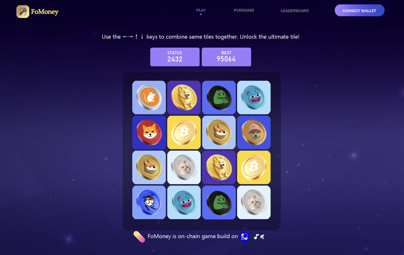 Enable the auto-confirm feature on Nightly to merge identical tiles. Each move will be an on-chain transaction. Combine identical tiles using the ←→↑↓ keys (on PC), watching them merge into one. When three identical blocks align, the rightmost pair shall unite first. The ultimate goal is to reach 2048 (or BTC tile).