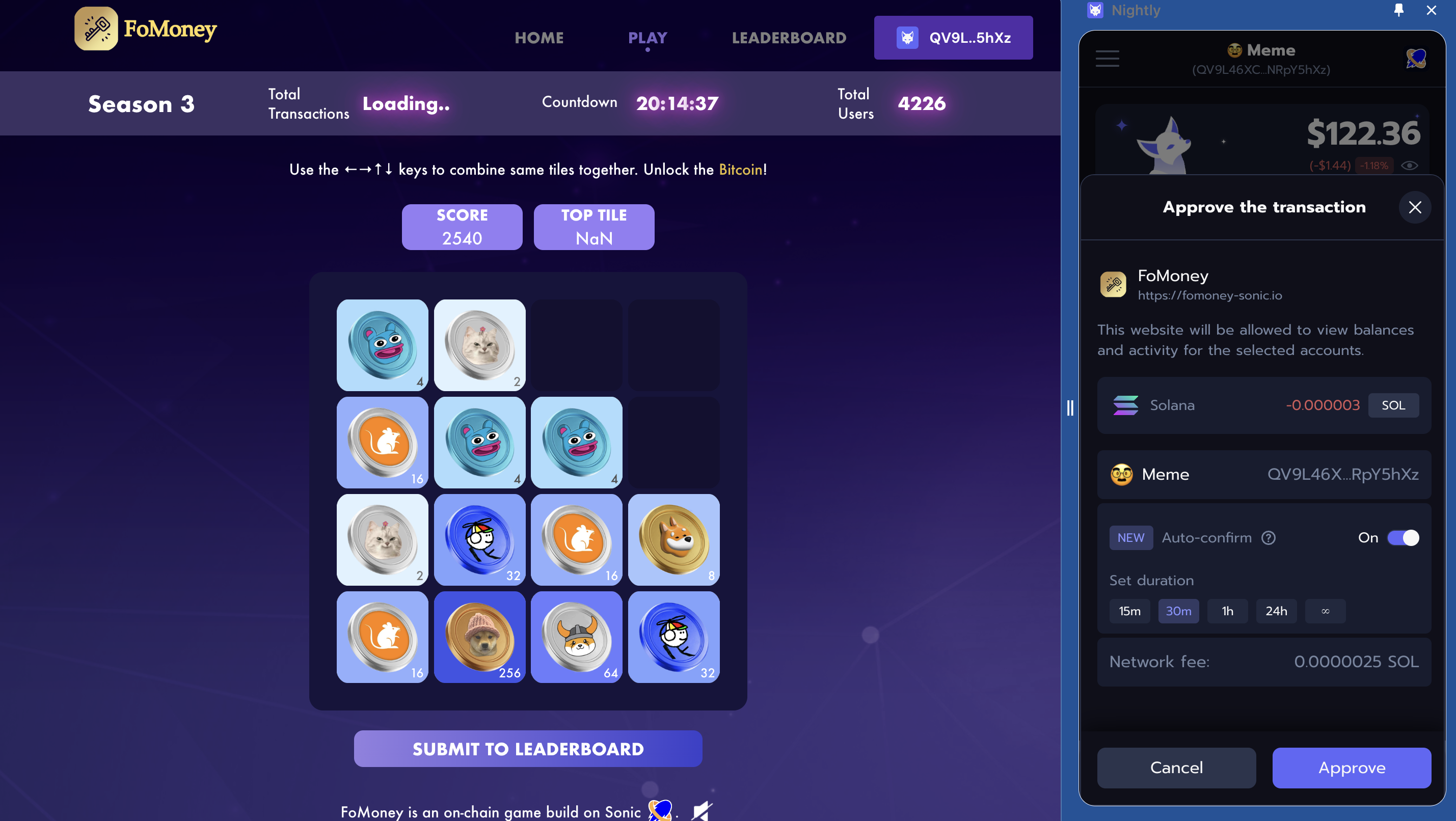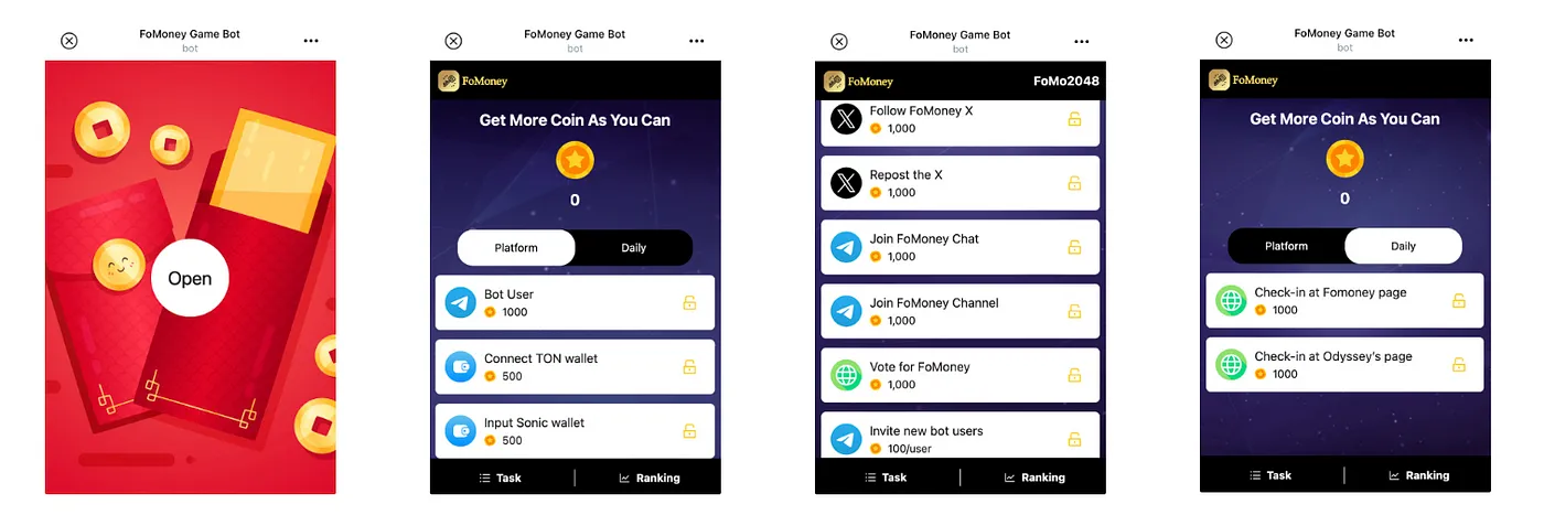 You can simply play FoMoney to finish Task-TX Milestone on Sonic. When the Leaderboard is launched, you will be able to win additional rewards by becoming TOP 10 on the Daily Contest Leaderboard or reaching the BTC/2048 tile.