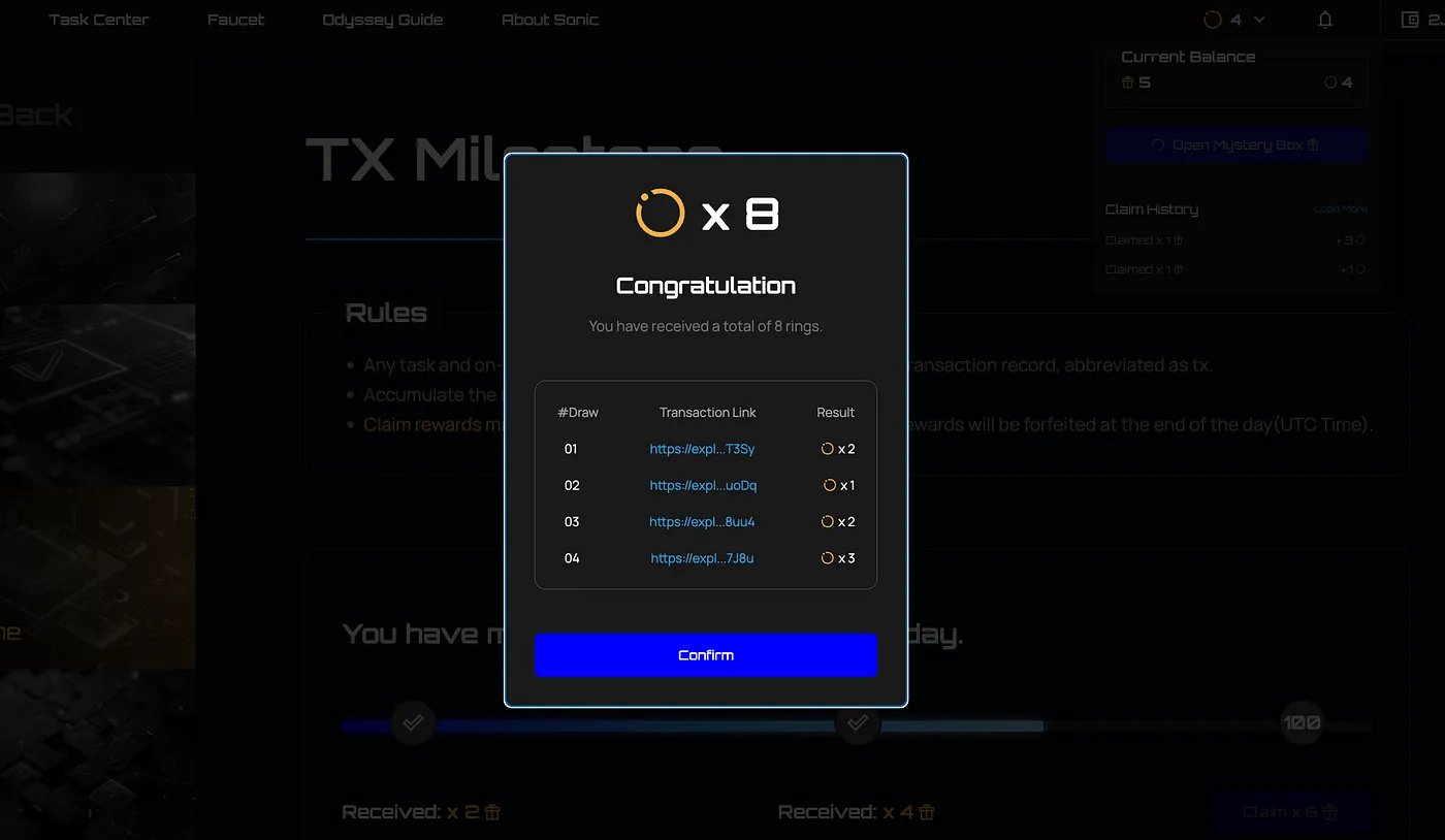 Don’t forget to claim your **🎁 Ring Mystery Boxes** on the Tx milestone, and open all boxes to claim the **💫 Sonic Odyssey Rings**! If your Tx exceeds 100 Tx, you will be able to claim 6 boxes daily.