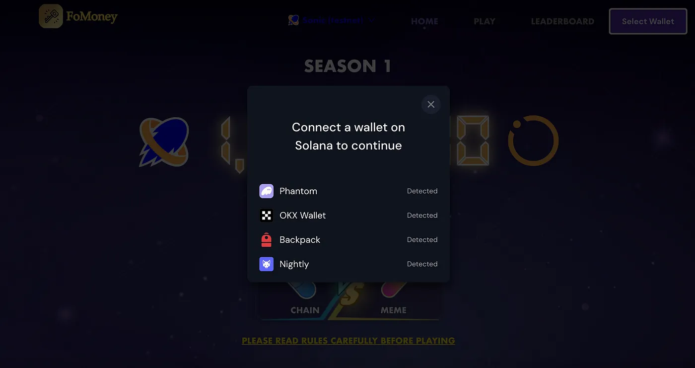 Log into [https://fomoney-sonic.io](https://fomoney-sonic.io/) or <https://fomoney.io/> (select Sonic Devnet), and connect your wallet.