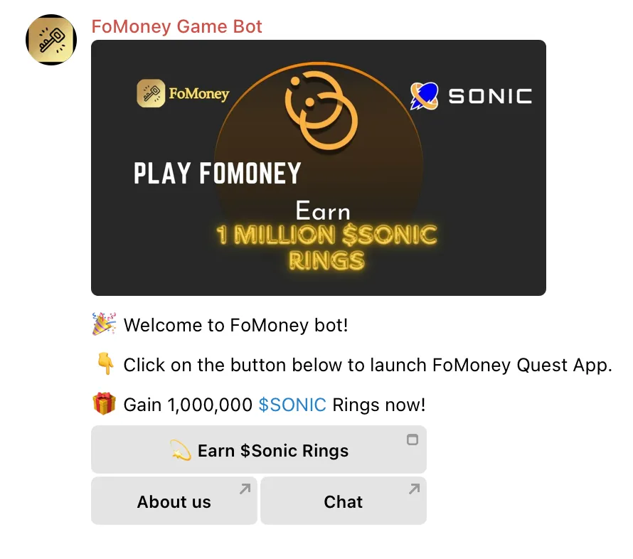 ### 2.2 Earn Sonic Odyssey Rings by completing tasks through FoMoney’s Telegram Quest Bot <a href="#a01e" id="a01e"></a>