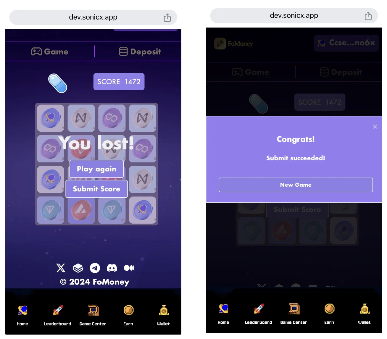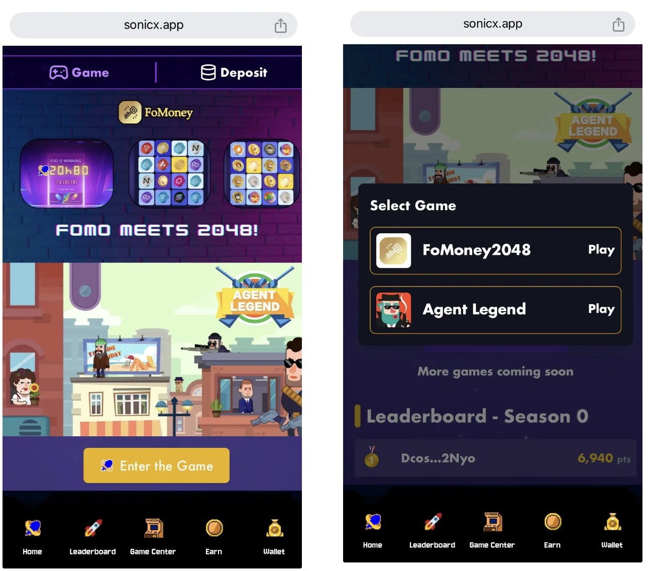 Please note that the "Play with Key and Deposit functions" will be available soon, you may Play with SonicX for now. Simply click "Play with SonicX," then select "Enter the Game" to choose between FoMoney2048 or Agent Legend.